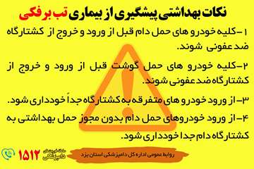 هشدار بهداشتی دامپزشکی درخصوص پیشگیری و کنترل بیماری تب برفکی 1404/08/06 - 12:11 - تعداد بازدید: 14 - کد خبر : 347251 - گروه خبری : اسلایدر,هشدارهای بهداشتی - تعداد نظرات : 0